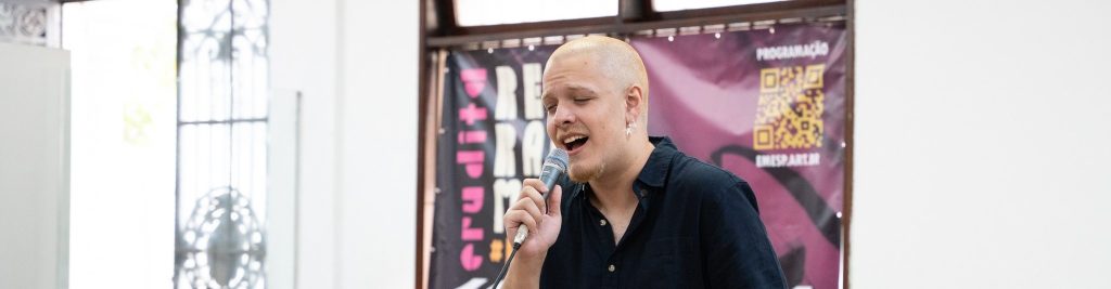 Ementa: O curso é destinado a cantoras e cantores inseridos no universo da canção brasileira, e propõe práticas coletivas e individuais de pesquisa e ampliação da propriocepção corpo-vocal como ferramenta de construção de performance. Em perspectiva decolonial, o trabalho busca reconhecer e desconstruir padrões e hábitos corpo-vocais, provocar as/os participantes a pesquisar memorias, afetos e singularidades para formar um repositório de possibilidades expressivas, de modo a vivenciar uma performance musical e cênica mais aprofundada, consistente, diversa e multidimensional. O trabalho se desenvolve em grupo e todas as práticas são realizadas a partir de combinados coletivos.